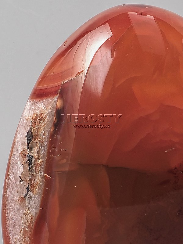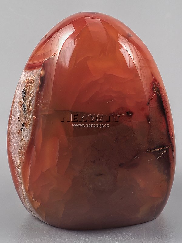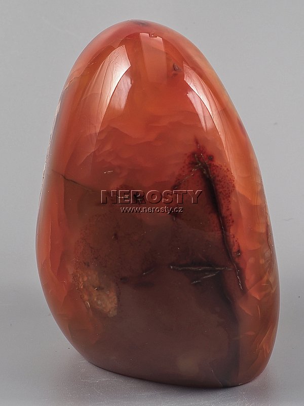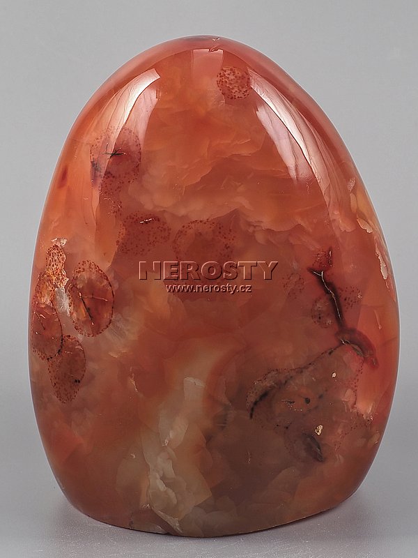 Volně tvarovaný a leštěný kus oranžově červeného karneolu s neopakovatelnou kresbou.