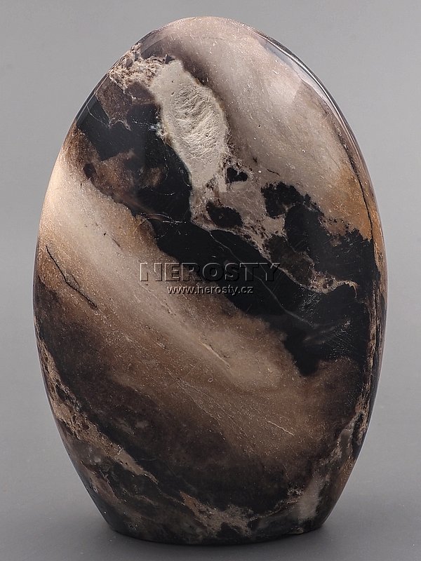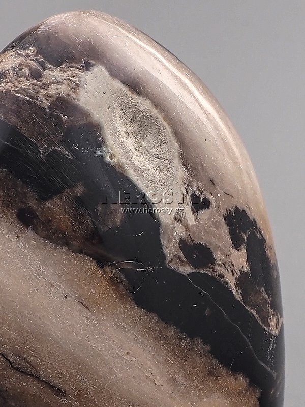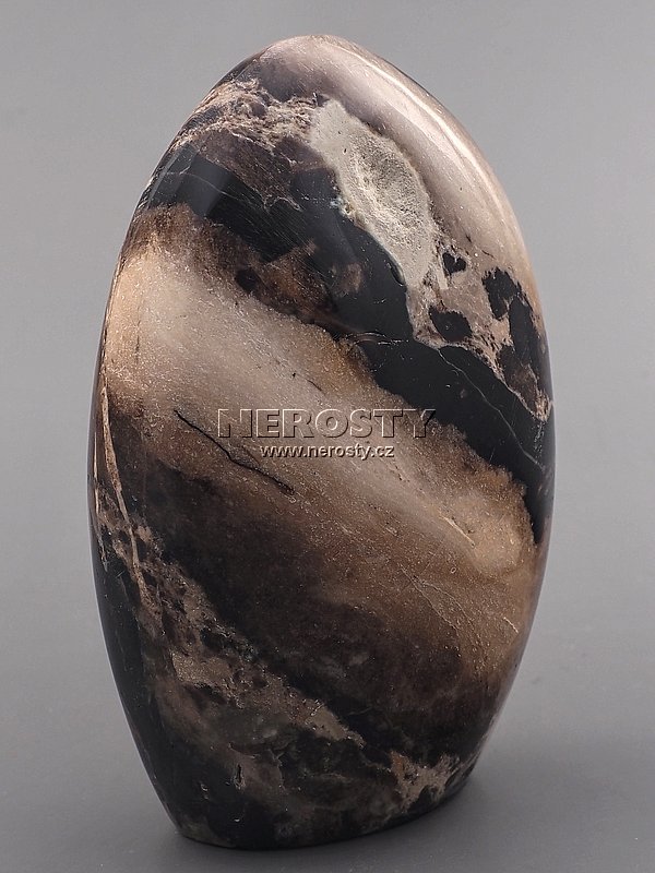 Volně tvarovaný a leštěný kus zopalizovaného zkamenělého dřeva s výraznou strukturou.