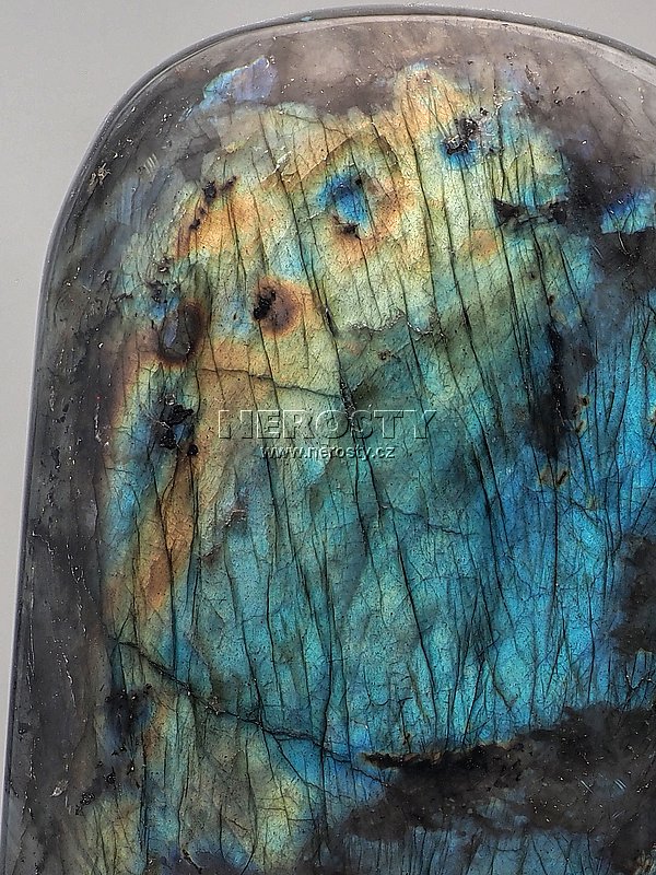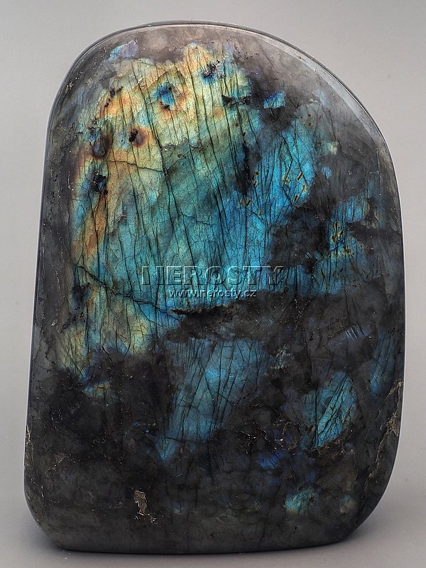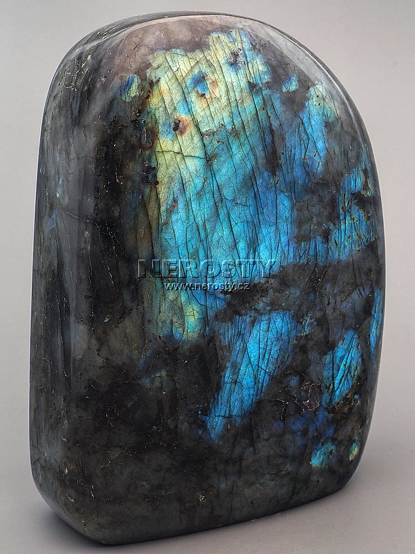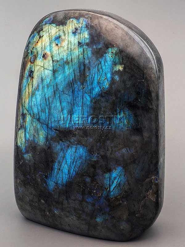 Volně tvarovaný leštěný kus labradoritu s intenzivní převážně ocelově modrou barvoměnou.